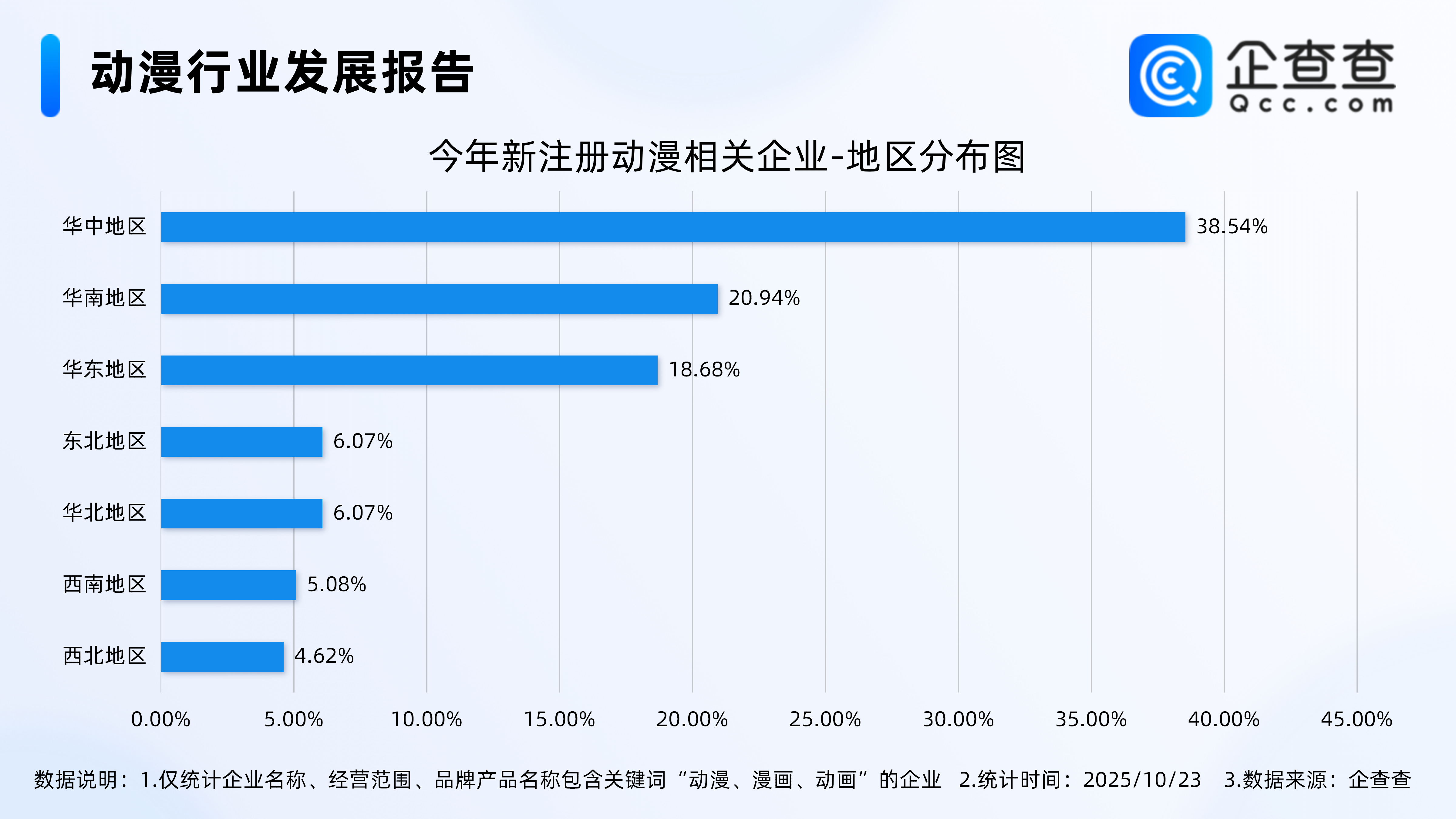 企查查数据显示,从地区分布来看,今年新注册的动漫相关企业主要分布在华中地区,占比达38.54%。其次,分布在华南地区、华东地区的动漫相关企业分别占比20.94%、18.68%。
